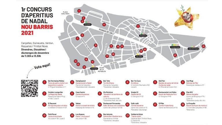 Arriba a Nou Barris el primer concurs d’aperitius de Nadal. Es tracta d’una iniciativa del districte que es durà a terme en els establiments de restauració que trobareu en aquest mapa, als barris de la Guineueta, Canyelles, Verdun, les Roquetes i la Trinitat Nova.