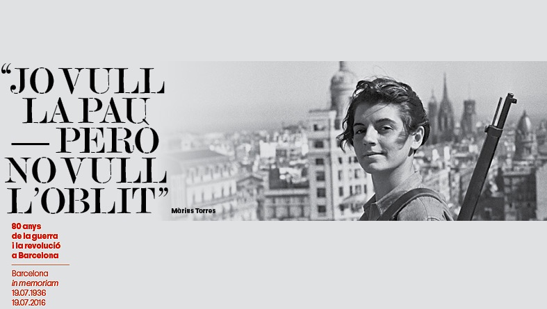 Una altra de les accions previstes per l’Ajuntament en el marc dels 80 anys de la guerra i la revolució a Barcelona és la col·locació demà dimarts de catorze lones a diferents espais de la ciutat. En aquestes lones hi figurarà el text “Barcelona in memoriam 19.07.1936 – 19.07.2016”, i un breu poema de Màrius Torres, escrit l’any 1942: “Jo vull la pau però no vull l’oblit”. La protagonista del cartell (sobre aquestes línies) és la mirada victoriosa, però també tranquil·la i serena, de Marina Ginestà i Coloma, una jove miliciana, periodista i traductora que va ser fotografiada per Hans Gutmann (Juan Guzmán) el 21 de juliol de 1936, amb Barcelona de fons i que va esdevenir una icona del moment. Aquestes pancartes estaran penjades fins al 29 de juliol, en record d’uns fets que formen part de la identitat de la ciutat. A Nou Barris, la pancarta es penjarà d’un dels símbols més visibles del districte, el castell de Torre Baró.
