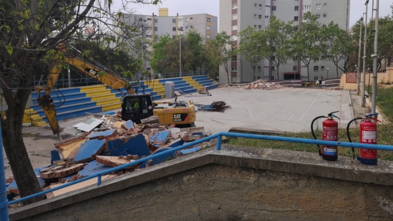 Les màquines ja han començat la destrucció de la pista del CEM Guineueta, de cara a la construcció d’un pavelló cobert que està previst que s’estreni el febrer de 2020. De moment estan treballant en el paviment però després han d’enderrocar-ne les grades i els vestidors.