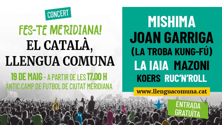 Avui és un dia gran a Nou Barris per la quantitat d’actes culturals i festius que s’hi celebren i més d’un tindrà greus problemes per elaborar l’agenda de la jornada. L’esdeveniment estrella del dia és, sens dubte, el concert «Fes-te Meridiana. El català, llengua comuna»  que porta a l’antic camp de futbol de Ciutat Meridiana (situat a l’avinguda dels Rasos de Peguera, 55) alguns dels grups de la millor música en català, amb les actuacions de Mishima, Joan Garriga (La Troba Kung Fú), La iaia, Mazoni, Koers i Ruc’n’Roll. A més, l’entrada és gratuïta i des de les 17h també hi haurà activitats infantils i d’una mostra d’entitats i associacions del barri. Teniu més informació i els horaris al web del concert.