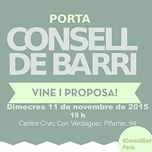 El centre cívic Can Verdaguer (carrer de Piferrer, 94) acull avui a les 19h el primer Consell de Barri de Porta d’aquest mandat. A la sessió es parlarà dels mecanismes i canals de recollida d’aportacions per al Pla d’Actuació Municipal (PAM) i el Pla d’Actuació de Districte (PAD). També es presentaran els projectes comunitaris que s’estan fent a Porta com ara el Transforma Porta, el Pla Buits o El Mercat Importa.