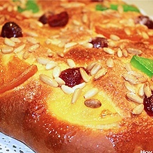 Estireu-la sobre una placa de forn untada amb oli o mantega. Ha de tenir un gruix d’1 cm aproximadament i forma ovalada. Pinteu-ho amb ou i col•loqueu-hi al damunt les fruites confitades, tallades a trossos, i deixeu-ho reposar fins que dobli el volum. Repartiu-hi els pinyons per sobre, tireu-hi sucre pel damunt i coeu-ho al forn a 180 ˚C uns 20 minuts.