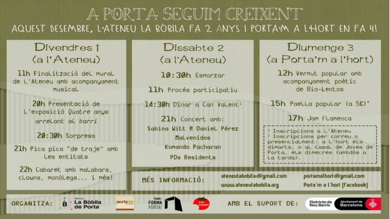 Aquest desembre el barri de Porta celebra un gran festa d’aniversari per partida doble. D’una banda, l’Ateneu la Bòbila arriba compleix els dos anys com a centre que aplega un bon grapat d’entitats, i de l’altra banda el projecte del solar del pla buits Porta’m a l’Hort arriba als 4 anys en funcionament. Per celebrar-ho, els dos projectes sorgits del veïnat preparem activitats per al cap de setmana. Avui dissabte, la Bòbila organitza un esmorzar, un procés participatiu, un dinar a Can Valent i una concert. Per demà diumenge, Porta’m a l’Hort prepara una vermut popular acompanyat de poemes, una paella popular i una jam flamenca.