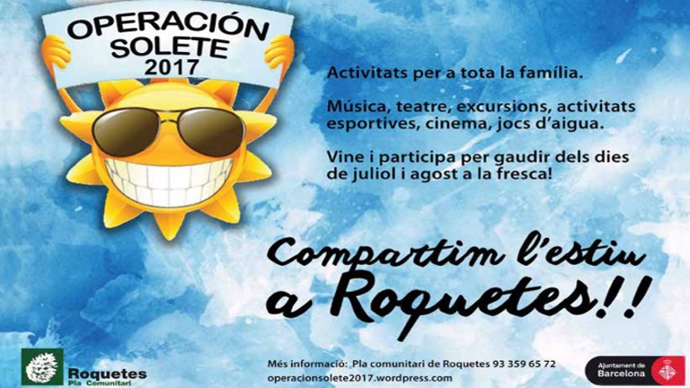 Un any més, el Pla Comunitari de Roquetes ha programat una sèrie d’activitats per aquest estiu, per tal que tots aquells que romanin al barri al juliol i a l’agost, tinguin opcions ben variades per divertir-se. A més, es vol fomentar la bona convivència entre veïns. El nom clau és el de “Operación Solete”. Sota aquest títol han organitzat activitats de música, teatre, excursions, activitats esportives, cinema i jocs d’aigua. Al web podeu consultar el programa del mes de juliol i el del mes d’agost.