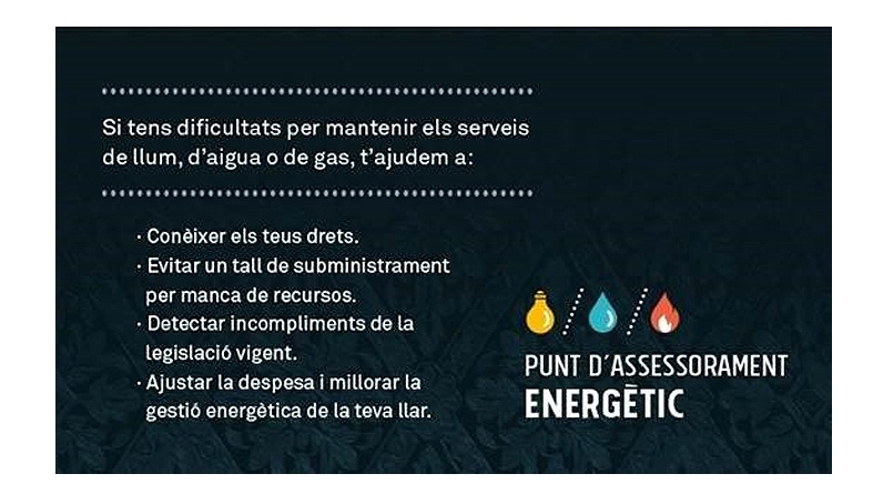 Nou Barris estrena dos nous Punts d’Assessorament Energètic, concretament ubicats a Verdun i a la Zona Nord. Avui es presenten al casal de Barri de Verdun, de la mà de la regidora de Nou Barris, Janet Sanz, i la tercera tinenta d’alcalde, Laia Ortiz. Serà a les 20h quan expliquin i resolguin dubtes, en un acte obert a tothom, en què consisteixen els Punts d’Assessorament Energètic (PAE). Es tracta d’un servei que ofereix l’Ajuntament de Barcelona per donar informació, l’atenció i la intervenció necessàries perquè les persones puguin exercir els seus drets energètics i les companyies no els neguin l’accés als subministraments bàsics, basant-se en la llei 24/2015, que prohibeix a les companyies subministradores efectuar talls de subministrament si l’impagament es produeix per manca de recursos econòmics i les obliga a mantenir el servei de llum, gas i aigua mentre duri la situació de vulnerabilitat o de dificultat econòmica.