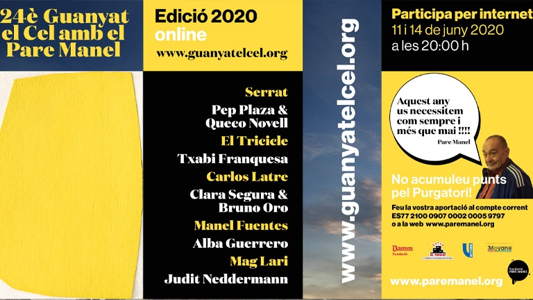 Per primera vegada, però, les circumstàncies han fet que el Guanya’t el Cel amb el Pare Manel se celebri de manera on line, a través del web del festival. Serà en dues úniques funcions a les 20h, el proper dijous 11 de juny i diumenge 14 de juny. Com és habitual, l’espectacle comptarà amb artistes de renom com Clara Segura, Bruno Oro, Carlos Latre, Alba Guerrero, el Mag Lari, Pep Plaza, Queco Novell, Txabi Franquesa, Judit Nedermann, el Tricicle i Joan Manel Serrat. L’accés al visionat del festival és gratuïta, però en ser un espectacle benèfic, es convida a fer aportacions econòmiques al compte corrent ES77 2100 0907 0002 0005 9797 o a través del web www.paremanel.org.
