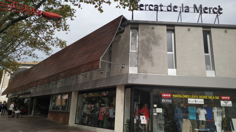 La façana del passeig de Fabra i Puig del Mercat de la Mercè ja està descoberta i llueix un aspecte més modern. Una nova estructura de lames de fusta, que recorda les persianes dels comerços antics, cobreix ara la façana i genera també un petit porxo al llarg de l’equipament. Aquesta estètica ja s’havia aplicat als altres dos accessos del Mercat.
