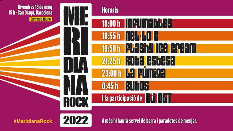 El parc esportiu de Can Dragó, concretament la plaça entre el camp de futbol de l’Alsamora i les avingudes de Rio de Janeiro i Meridiana, seran avui escenari de la tercera edició del Meridiana Rock. Arriba en el marc de la Festa Major de Porta, des de les 18h de la tarda i durant vuit hores, Plataforma per la Llengua ofereix tot de concerts amb un factor en comú: són bandes que canten en català. Parlem dels següents grups que actuaran amb aquests hroaris previstos: