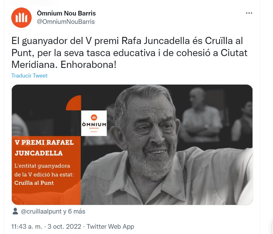 La cinquena edició dels premis Rafa Juncadella, creats per Òmnium Cultural – Nou Barris, reconeixeran la tasca “educativa i de cohesió” que du a terme, dia a dia, el Cruïlla al Punt, el restaurant-escola ubicat a la plaça dels Eucaliptus i gestionat pel PES Cruïlla – Salesians Sant Jordi. El Cruïlla al Punt és un dels projectes d’inserció laboral per a joves que lidera aquesta entitat. Els joves reben formació professional en restauració, però també se’ls ajuda a desbloquejar emocionalment, ja que molts es troben en situacions difícils o sense cap perspectiva de futur. Als fogons, la barra i la sala menjador aprenen un ofici però també guanyen confiança en si mateixos i, fins i tot, comencen a fer plans de futur.