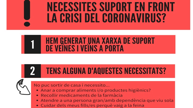 La crisi del coronavirus ha despertat la solidaritat, com la que inspira la donació de material de protecció per al personal mèdic, o la crida a la comunitat maker per produir amb les impressores 3D respiradors i mascaretes. A nivell dels nostres barris, la solidaritat s’ha manifestat en la creació de xarxes de suport mutu. És tot un teixit en què es demana la col·laboració dels veïns i veïnes per, d’una banda, identificar persones vulnerables a qui li cal algun tipus d’ajuda, i d’altra banda, recopil·la un llistat de persones que poden col·laborar d’alguna manera, ja sigui des de portar medicaments o aliments a casa dels més grans, a tenir cura de menors en cas que els pares no se’n puguin fer càrrec mentre treballen, donar suport psicològic, o assessorar laboralment les persones afectades per ERTE, ERO o que tinguin algun tipus de conflicte laboral com a conseqüència d’aquesta crisi. Un equip s’encarrega de fer els emparellaments entre els voluntaris que volen col·laborar i els ciutadans que sol·liciten assistència.