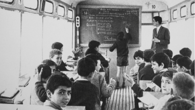 Als anys 60, els barris de la perifèria obrera de Barcelona tenien una gran mancança d’equipaments educatius. No hi havia prou escoles i eren molts els infants d’aquestes zones sense escolaritzar. Per tal de resoldre el problema, la regidora falangista i presidenta de la Junta Municipal de Enseñanza, Montserrat Tey, va decidir optar per una solució provisional mentre s’estava pendent de la construcció de diversos grups escolars. Al barri de Torre Baró, enlloc d’instal·lar barracons prefabricats per la manca de pressupost i de disponibilitat, es va optar per l’adquisició de dotze tramvies a Tranvías de Barcelona que es desproveirien de motor, controla, tròlei i seients per habilitar-los al seu interior com a aules escolars, amb pupitres per a dos alumnes cadascun, una taula i una pissarra per al professor.  Es van instal•lar al costat del berenador de la Font dels Eucaliptus, on avui dia hi ha l’estació de metro de Torre Baró, i amb el nom de Grupo Escolar San Juan.