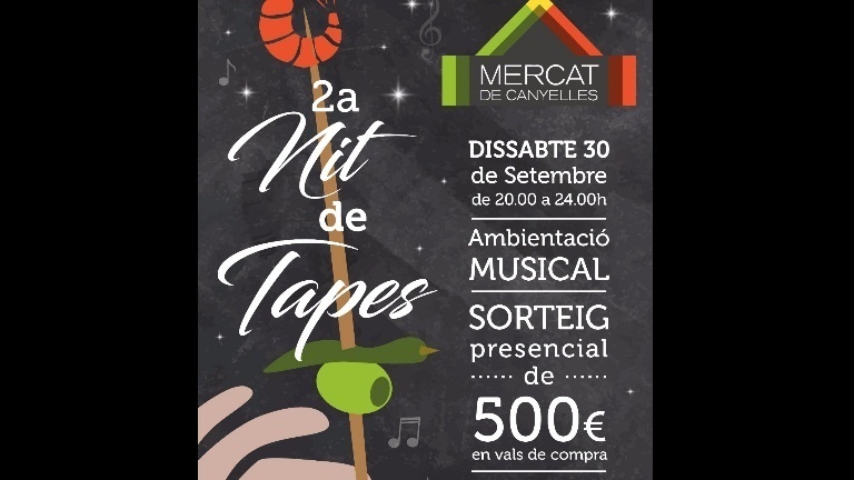 De 20 a 24h 2a NIT DE TAPES: animació infantil, ambientació musical, sorteig presencial de 500 € en vals de compra. Per cada tapa, un ticket de participació fins a exhaurir existències (Mercat de Canyelles)
