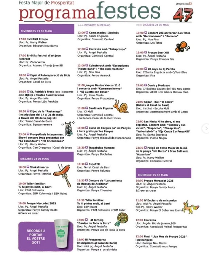 La Prosperitat ja ho té tot a punt per a la 47a edició de la seva Festa Major, que se celebrarà del 23 de maig a l’1 de juny de 2025 als principals carrers i places del barri. El programa d’activitats ja és públic i inclou més d’una quarantena de propostes pensades per a tots els públics: música en directe, tallers infantils, concursos, mostres culturals i activitats de les penyes, autèntic cor de la celebració.