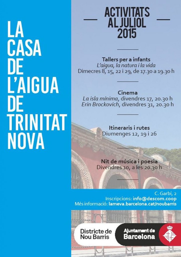 La Casa de l’Aigua de la Trinitat Nova celebra el seu primer estiu amb aspecte i instal·lacions renovades amb tot un seguit de tallers i activitats per a tothom. Tallers per als infants, cinema a la fresca, itineraris i rutes i, també, nit de música i poesia. Tot de manera gratuïta. El programa s’enceta avui amb uns taller de jocs amb aigua per als nens i nenes. Aquesta activitat, com algunes altres, exigeix preincripció, que es pot fer al correu electrònic info@descom.coop.