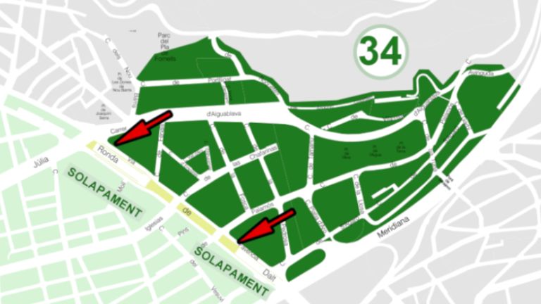 En total seran 1.042 noves places d’estacionament regulat que donen prioritat als residents i que s’identifiquen amb pintura verda. Els vehicles dels no residents a la zona 34 només podran estacionar un màxim de dues hores dins de l’horari de regulació que indiqui el senyal vertical corresponent i amb la tarifa d’àrea verda que correspongui a l’etiqueta mediambiental del vehicle. A més, està previst crear al barri 186 noves places d’àrea Motos i 12 noves places d’àrea DUM (càrrega i descàrrega).