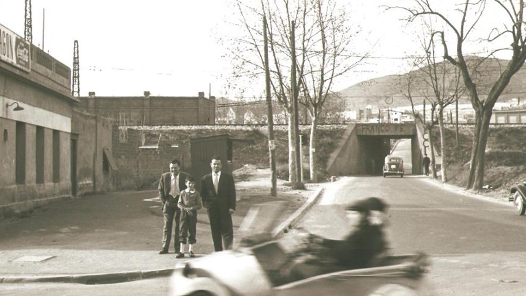 Els anys 1950, l’entorn va fer un canvi radical. El soterrament de les vies del tren i la construcció de la prolongació de la Meridiana fins a la Trinitat la dècada següent, van separar els dos barris. El pont es va fer de nou i per sobre ja no hi passaven els trens sinó cotxes. També hi van començar a circular més vehicles per entrar i sortir del passeig de Valldaura, cap als barris de la Guineueta, Porta o la Prosperitat, entre d’altres. D’aquesta època és aquesta fotografia, en la qual podem apreciar un biscúter en primer terme.
