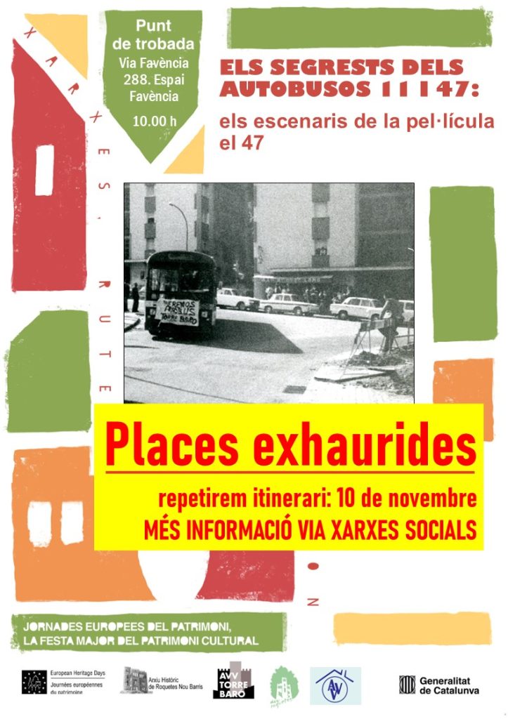 L’èxit de la pel·lícula ‘El 47’, sobre el segrest del bus 47 per part de Manuel Vital per reclamar transport públic a Torre Baró, ha posat en el focus aquest barri i n’ha despertat l’interès de moltes persones. Una prova és que l’Arxiu Històric de Roquetes-Nou Barris ha esgotat les places de la ruta guiada que proposen per a aquest diumenge 13 d’octubre. Es tracta d’una ruta per aquells escenaris clau en la història del segrest del bus i que es reflexen a la pel·lícula de Marcel Barrena. La ruta partirà de la seu de l’arxiu per pujar cap a Torre Baró i recórrer la part alta i els carrers per on Vital va fer baixar l’autobús articul·lat.