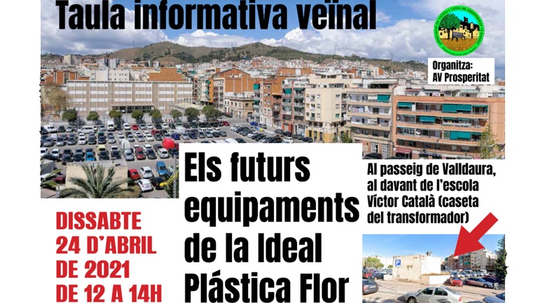 L’AV Prosperitat convoca avui dissabte a tota aquella persona interessada en saber com es transformarà l’illa que en el passat va ocupar la fàbrica Ideal Plàstica Flor. Concretament és el terreny situat entre el passeig de Valldaura i els carrers de Font d’en Canyelles i de Santa Engràcia. Allà s’alçava la factoria, dedicada a la fabricació de flors ornamentals fins que durant els 90 va entrar en crisi, coincidint amb la mort del propietari. Davant la pressió veïnal, l’Ajuntament va adquirir la propietat del solar per 40 milions d’euros i va enderrocar la fàbrica l’any 2009. La intenció era construir equipaments a la zona però amb l’arribada de la crisi es va aturar el projecte. Va ser llavors quan l’Ajuntament va decidir construir-hi provisionalment una zona d’aparcament en superfície i una zona de jocs infantils en espera de temps millors.