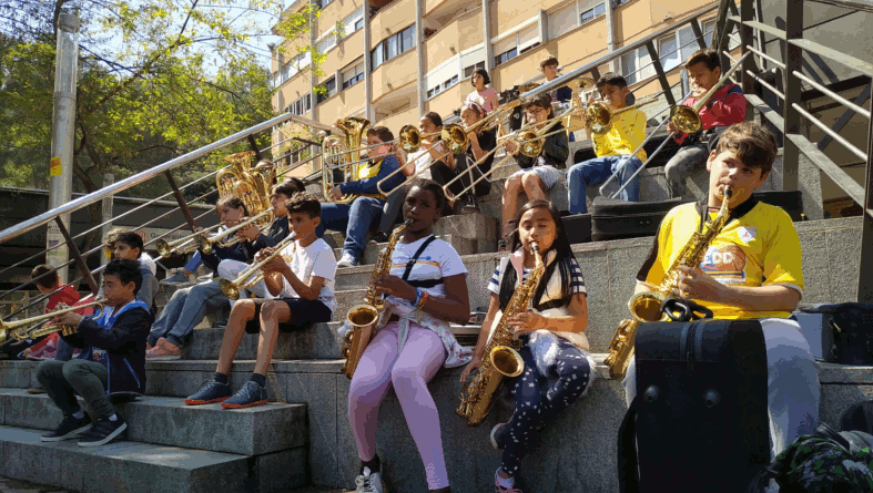 Les dues ‘big bands’ de l’Elisensa de Montcada han tret aquest dimecres al carrer els instruments per assajar. Els veïns han gaudit d’un petit tast del que els alumnes de quart i cinquè aprenen dins l’horari lectiu. “Totes aquestes activitats ajuden molt a la cohesió social – explica Toni Cívico, el director de l’Escola Elisenda de Montcada – Els artistes que venen a les aules fan un treball educatiu molt bo. A banda de l’aprenentatge d’un instrument es treballen molt altres aspectes com la convivència, el treball en equip, etc.” I és que el projecte EducArts persegueix millorar la comunicació entre els estudiants i fomentar la convivència. I un tercer objectiu, teixir comunitat. “Generar la connexió entre escoles, i entre escoles amb entitats i equipaments del barri.- explica Estefanía Soler, coordinadora EducArts- I aquí neix la connexió amb el centre cívic de la Setmana de les Arts Escèniques, perquè hem de treballar junts.”