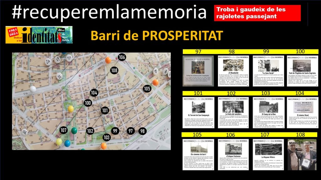 Fa dos anys l’Arxiu Històric de Roquetes-Nou Barris va decidir senyalitzar el refugi del carrer de la Florida, a la Prosperitat, en veure que, pel seu malestat, anava a ser cobert amb una llosa un cop fet l’estudi de l’interior. Van imprimir-ne un text breu, el van plastificar i el van enganxar sobre una rajola que, al seu temps, van col·locar a la paret, prop del refugi antiaeri. Així va començar la iniciativa de les rajoletes de la memòria i en aquests dos anys ja n’han enganxat 125. Assenyalen llocs desapareguts, capítols de la història dels nostres barris i també reten homenatge a veïns i veïnes que han contribuït d’alguna manera a millorar l’entorn o han tingut un paper especial a la zona.
