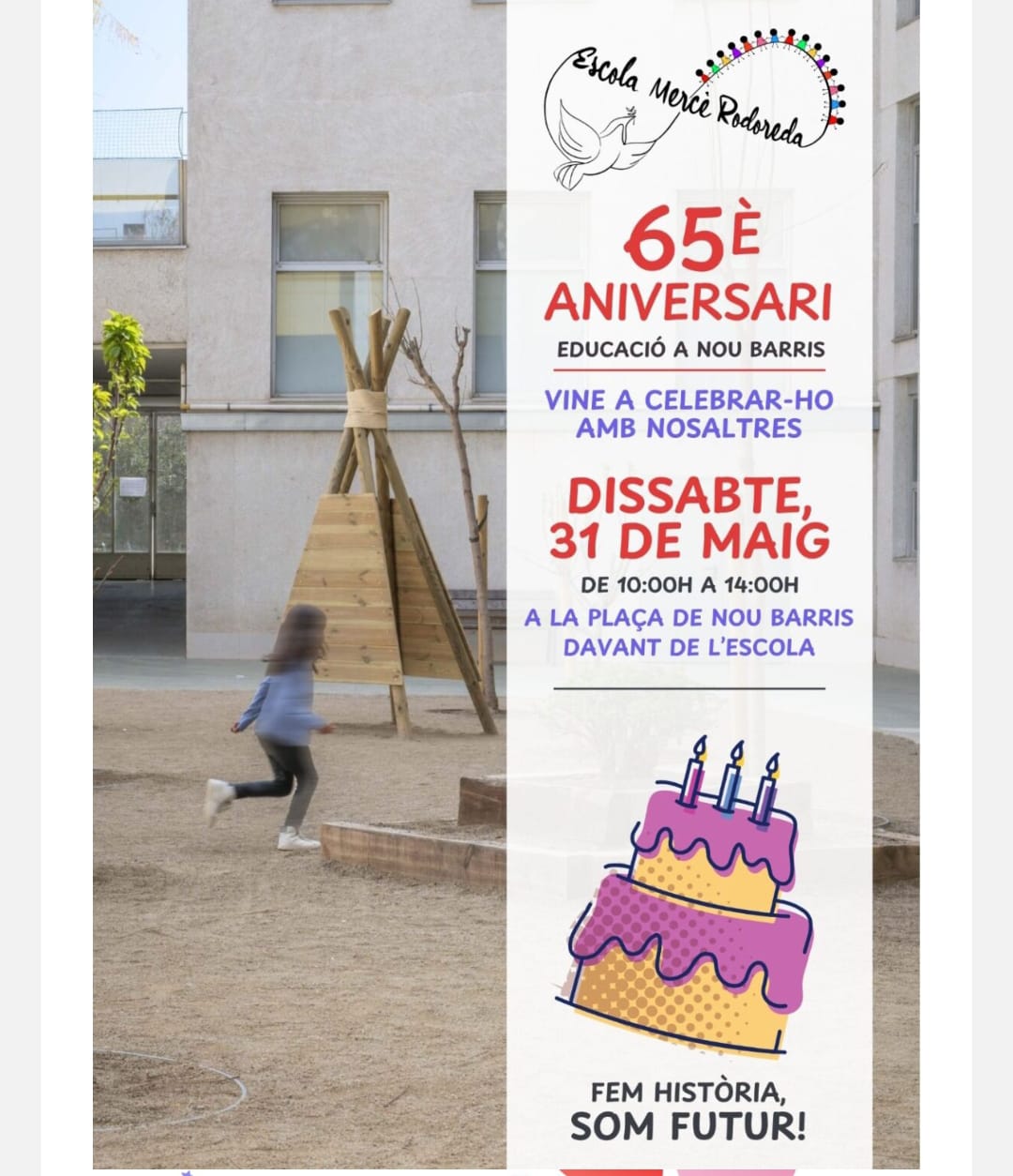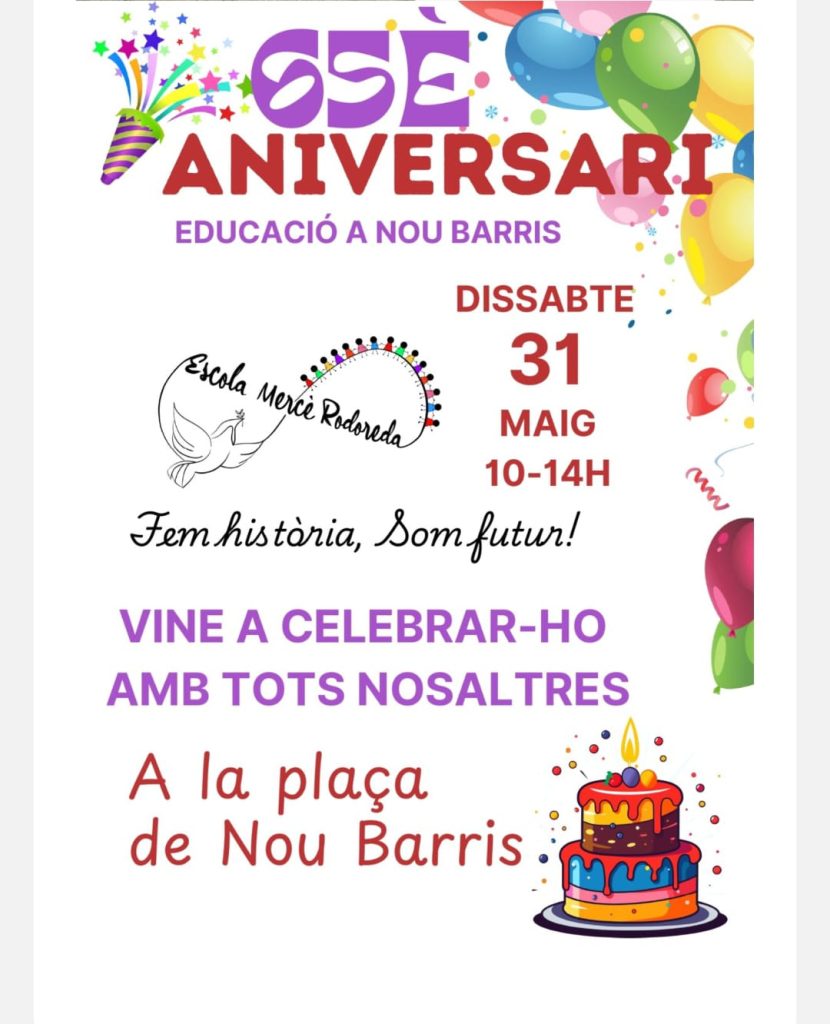 Aquest dissabte, 31 de maig de 2025, l’Escola Mercè Rodoreda celebra el seu 65è aniversari amb una gran festa oberta a tota la comunitat educativa i al veïnat de Nou Barris. L’acte central té lloc a la plaça de Nou Barris, just davant del centre, amb activitats des de les 10 del matí fins a les 14 h.