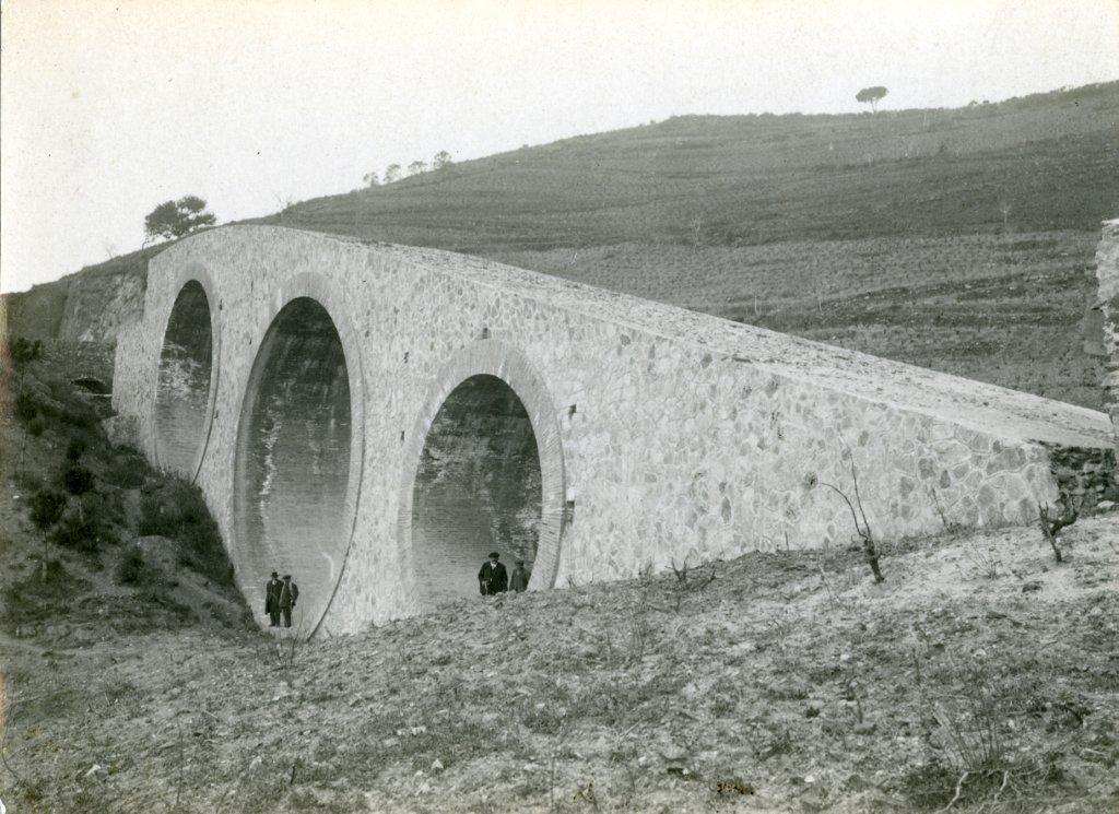 El Pont dels Tres Ulls correspon a l’aqüeducte de Montcada Alta, una infraestructura de portada d’aigua a la ciutat iniciada el 1893 que mai va arribar a entrar en servei. Tot i això, es va convertir en tot un símbol de la zona, ja que la seva situació elevada el feia visible des de tot el barri. També destacava pel seu aspecte, amb tres grans forats circulars, pensats per deixar pas a l’aigua que pogués baixar pels torrents de la muntanya. A la dècada dels 70 es va enterrar perquè es considerava perillós per la seva alçària. Unes obres de l’Ajuntament de Barcelona per generar unes feixes i restaurar el paisatge de l’entorn van posar al descobert l’any passat el pont oblidat.