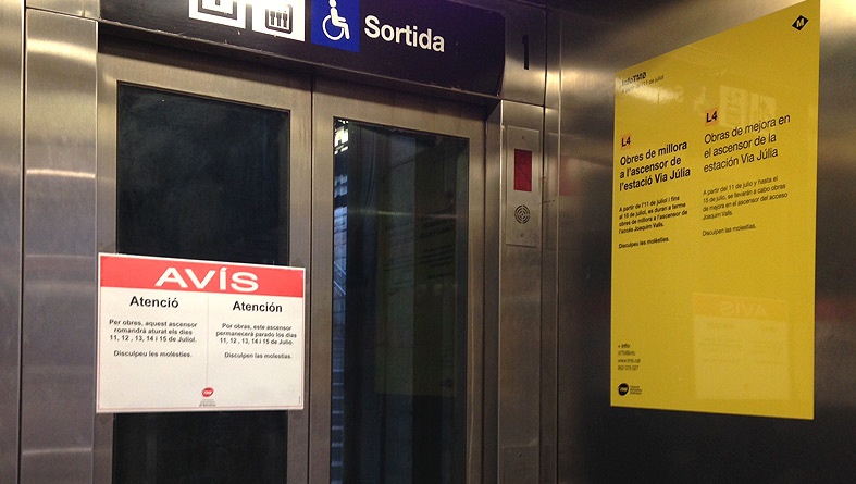 A partir d’avui i fins al proper divendres 15 de juliol es duran a terme obres de millora de l’ascensor de l’estació de metro via Júlia que dóna accés al carrer de Joaquim Valls. Per aquest motiu, l’ascensor restarà aturat durant els dies que realitzin les tasques. Amb les obres els usuaris esperen que se solventin els problemes i avaries que es repeteixen en cas de pluja.