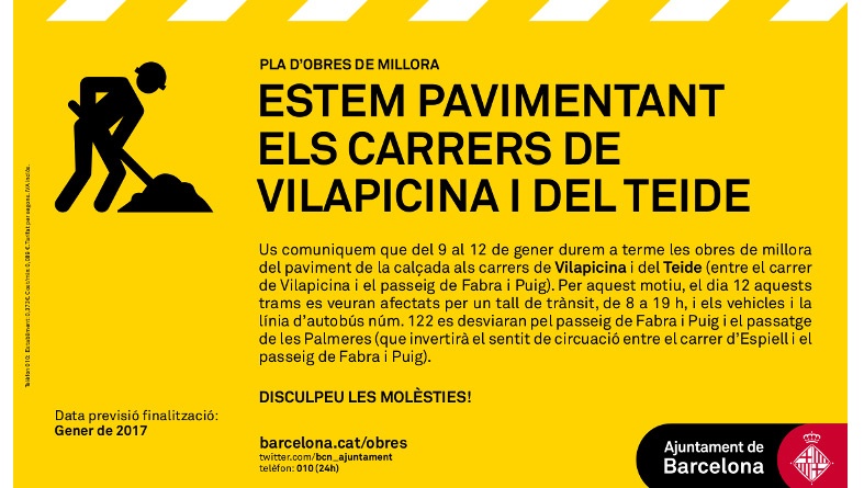 Entre el passat dilluns i demà dijous es duen a terme obres de millora del paviment de la calçada als carrers de Vilapicina i del Teide. Avui els cotxes encara hi podran transitar amb mínimes restriccions, mentre els operaris preparen la calçada. Dijous dia 12, però, el carrer de Vilapicina i el tram del carrer del Teide per sota de Fabra i Puig quedaran tallats al trànsit entre les 8 del matí i les 19h del vespre. Els vehicles i la línia de bus del barri 122 es desviaran pel passeig de Fabra i Puig i el passatge de les Palmeres per salvar aquest tram. El passatge de les Palmeres invertirà aquest dia el sentit de circuació entre el carrer d’Espiell i el passeig de Fabra i Puig per fer-ho possible.