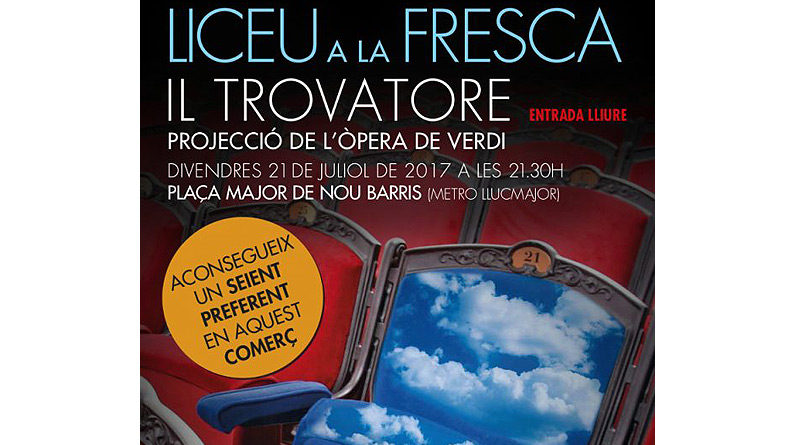 Per primera vegada avui es podrà gaudir d’una de les grans òperes del Liceu al districte, gràcies a l’streaming. La plaça major de Nou Barris convida avui a les 21.30h als veïns a gaudir a través d’una pantalla gegant de l’òpera Il Trovatore, de Verdi, a la Plaça Major de Nou Barris.