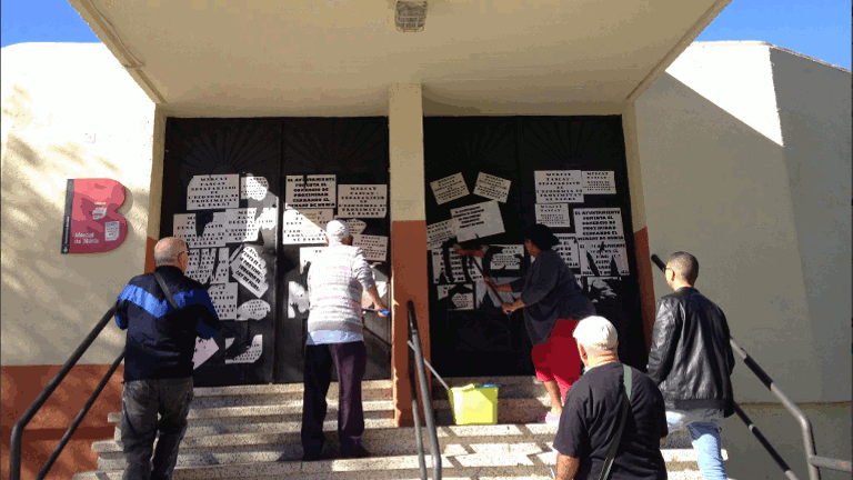 Els veïns també han tornat a encartellar el Mercat de Núria, tancat fa ara deu mesos. Demanen solucions a la manca de comerç i productes de primera necessitat a la part alta del barri. També han recuperat les pancartes antigues que el vent havia despenjat de la façana de l’equipament.