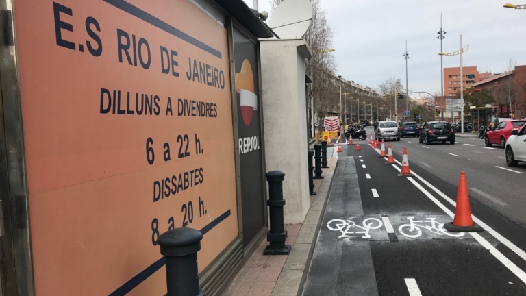 Els operaris enllesteixen els darrers retocs del nou carril bici de l’avinguda de Rio de Janeiro davant les crítiques de veïns i comerciants. Lamenten la pèrdua de zones de càrrega i descàrrega, d’aparcament lliure i fins i tot de places reservades per a discapacitats. En el cas d’una benzinera, temen que es puguin produir accidents a l’entrada i sortida, ja que els vehicles han de travessar el carril bici per accedir al negoci.