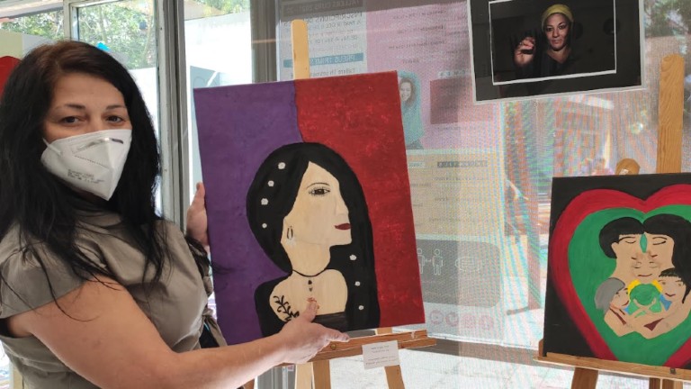 És tot un exemple de superació. Sabrina Amaro, una de les dones que col·labora i rep suport de l’entitat Lola no está sola, va tocar fons fa dos anys, quan després de viure maltractaments, es va quedar sense casa. Va recórrer a serveis com els menjadors socials, Lola no estás sola o la Creu Roja, entre d’altres. El confinament per la covid-19 el va passar en un centre de la Creu Roja, on va decidir apuntar-se a diverses activitats per omplir el temps. Una d’aquestes activitats era la pintura. “Al principi era un oci, em va agradar perquè em relaxava, però després em vaig adonar que em servia també per expressar allò del que no podia parlar. No volia explicar el que havia passat, que m’havia quedat sense llar, però a partir dels quadres podia explicar-lo -explica Amaro- Quan pinto foragito del cap els pensaments foscos. Per això pinto amb colors ben vius. Torno a viure”.