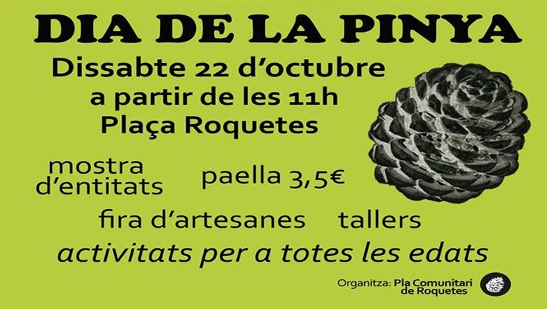 Les entitats de les Roquetes es troben avui per celebrar el Dia de la Pinya. Una trobada que vol festejar el model de gestió comunitària del barri i que vol donar visibilitat a tota la tasca que les entitats fan. Al llarg del matí, a plaça de les Roquetes, els veïns i les veïnes del barri podran gaudir de música, tallers en directe o una paella entre moltes altres activitats. Us adjuntem el programa d’activitats.
