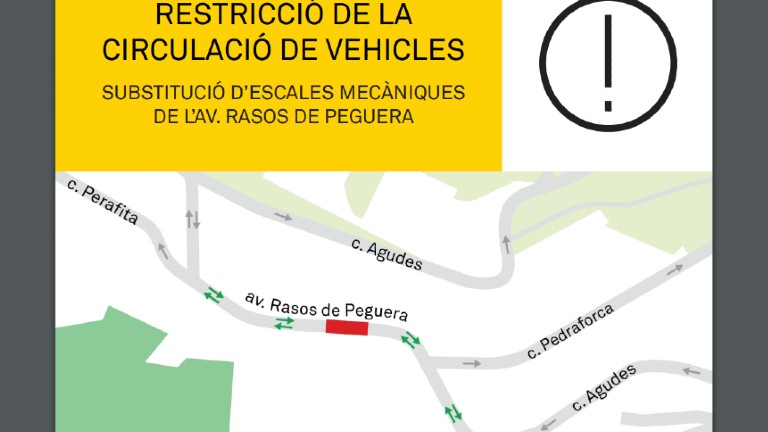 Es tracta d’una nova restricció al trànsit en le marc de les obres que s’estan duent a terme per substituir les escales mecàniques obsoletes. Aquest cop la grua de grans dimensions tornarà al barri per portar i instal·lar els tres trams restants de les noves escales mecàniques que s’estan col·locant a Rasos de Peguera. Tot i això, mentre durin les tasques, s’habilitarà l’accés en doble direcció per a guals i serveis dels carrers afectats, per permetre l’entrada i sortida.