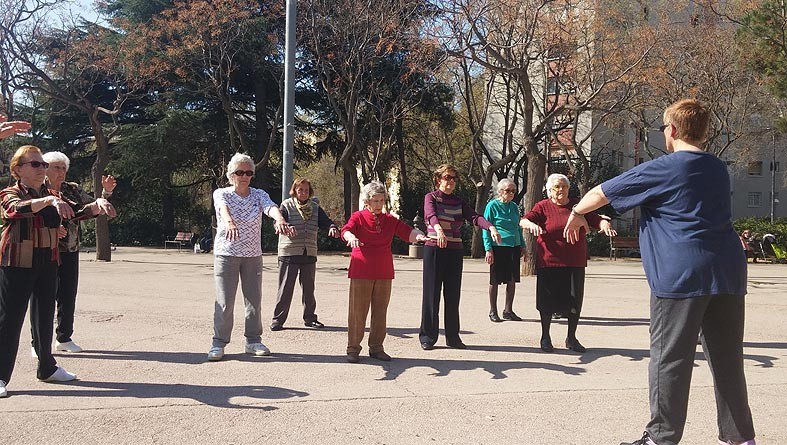 L’Escola de Salut de la Gent Gran de la Guineueta està formada per més de trenta veïns i veïnes que aprenen consells i trucs que van des de l’alimentació i l’ús responsable de les medicines, fins a les recomanacions dels Mossos d’Esquadra per evitar robatoris i furts. També fan petites sortides per conéixer de primera mà els recursos i activitats que tenen a prop per fer exercici i mantenir-se forts. Un exemple són les sessions de l’Activa’t al parc de la Guineueta. Tallers de txikung i taitxi que els fa fer exercici suau i recomanable per moure els ossos i activar l’energia del cos. Altre aspecte de sessions com aquesta és la de fomentar la relació entre veïns i veïnes i promoure que es coneguin i surtin de casa. “És una activitat preventiva de l’aïllament social. – explica Cristina Rey, infermera del Servei de Salut Comunitària –  La idea és aquesta, proporcionar una sèrie d’activitats que els vinculin d’alguna manera amb un grup i amb coses que es fan al terreny.”