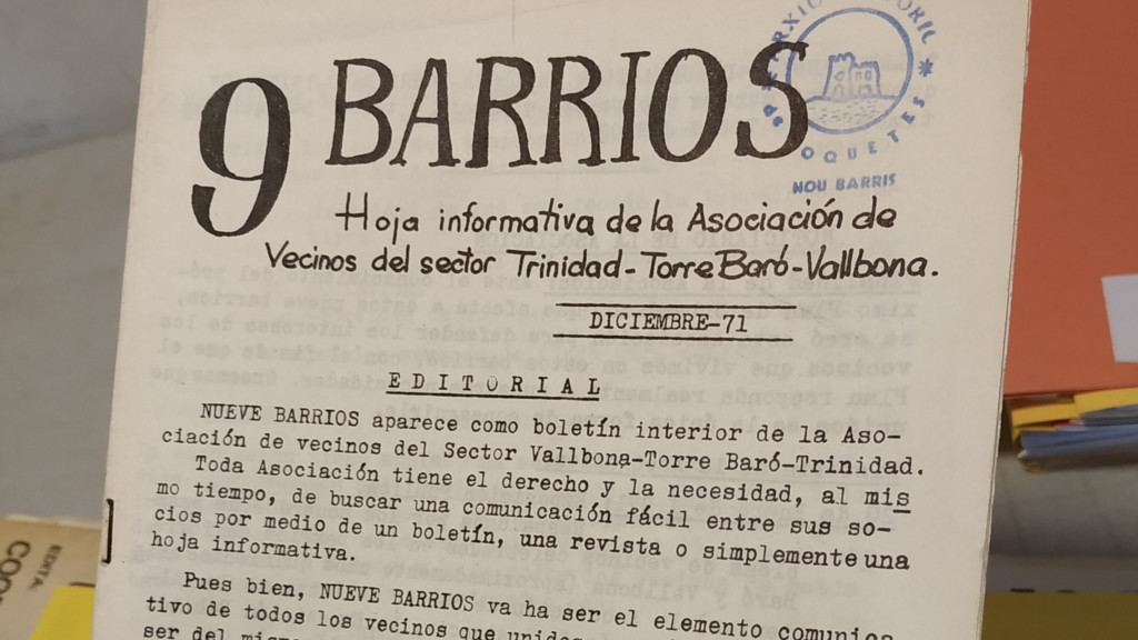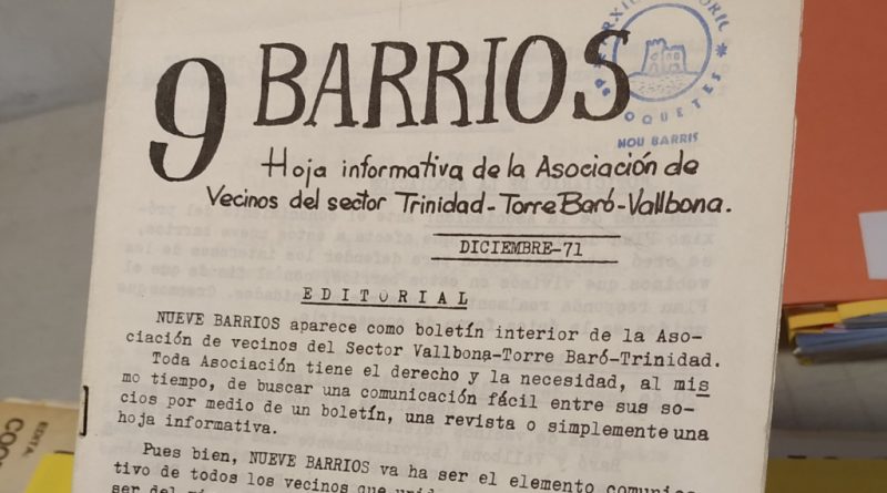 L’abril de 1970 es va fundar l’Asociación de Vecinos de 9 Barrios, la primera associació veïnal del districte de Nou Barris. De fet el nom surt precisament de la publicació d’aquesta entitat, que agrupava els nou territoris de la zona. Amb motiu del 50è aniversari de la fundació, l’Arxiu Històric de Roquetes – Nou Barris ha decidit dedicar al llarg de l’any tota una sèrie d’activitats per recordar la feina que van fer i fan les associacions veïnals per millorar els barris. “Hi ha una part de la història de les associacions i líders veïnals que és molt coneguda – explica Arnaldo Gil, de l’arxiu – Però nosaltres volem fer visible la història de molts altres veïns i veïnes anònims que van participar de les lluites també.”