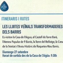 El districte de Nou Barris s’ha anat creant i transformant de la mà dels seus veïns i les reivindicacions i lluites que han protagonitzat al llarg del temps. Molts veïns no recorden o no van conéixer aquestes lluites com tampoc s’imaginen les condicions dels diversos barris en els inicis. Per això l’Arxiu Històric de Roquetes-Nou Barris ofereix una visita guiada en la qual transportaran als participants a alguns d’aquells escenaris. La ruta comença a les 9.30h a la Casa de l’Aigua de la Trinitat Nova i recorrerà el Castell de Torre Baró, l’Ateneu Popular de Nou Barris, la Torre del Rellotge i la Creu de la Trinitat. Finalment els assistents arribaran a l’Arxiu Històric de Roquetes-Nou Barris.