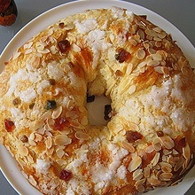 Banyeu amb ou batut la massa i deixeu-la coberta novament amb film una horeta aproximadament. Finalment, torneu a banyar-la amb ou batut i poseu-li el sucre mullat en l’aigua de tarongina, en algunes zones, i les ametlles laminades, en altres. Per acabar de decorar podeu afegir uns daus que s’utilitzen per als plum-cakes. Abans de ficar-lo al forn, retireu el cèrcol central.