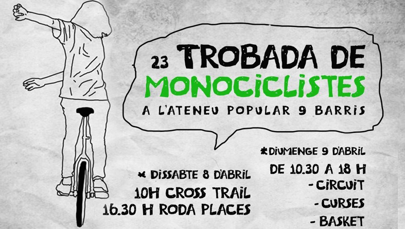 Els monocicles tornen a omplir un cop més els voltants de l’Ateneu Popular 9Barris. Avui i demà els amants d’una sola roda demostren les seves habilitats i equilibri a les diverses competicions. La clàssica Trobada de Monociclistes arriba enguany a la seva 23ena edició. A la cita no hi faltaran els circuïts i les curses, i el gran clàssic: el tradicional partit de bàsquet amb monocicle que se celebrarà demà diumenge abans de dinar. Avui hi haurà un circuït de muntanya per demostrar les habilitats dels monociclistes, també hi haurà un circuït urbà per les diferents places del barri, un taller de freestyle i flat. La tarda de diumenge està reservada per a l’intercanvi de trucs entre els participants, els jocs i les sorpreses. A continuació us detallem la programació: